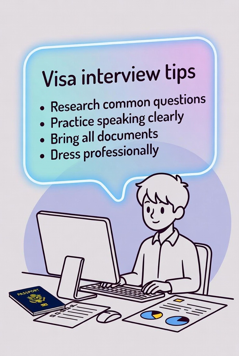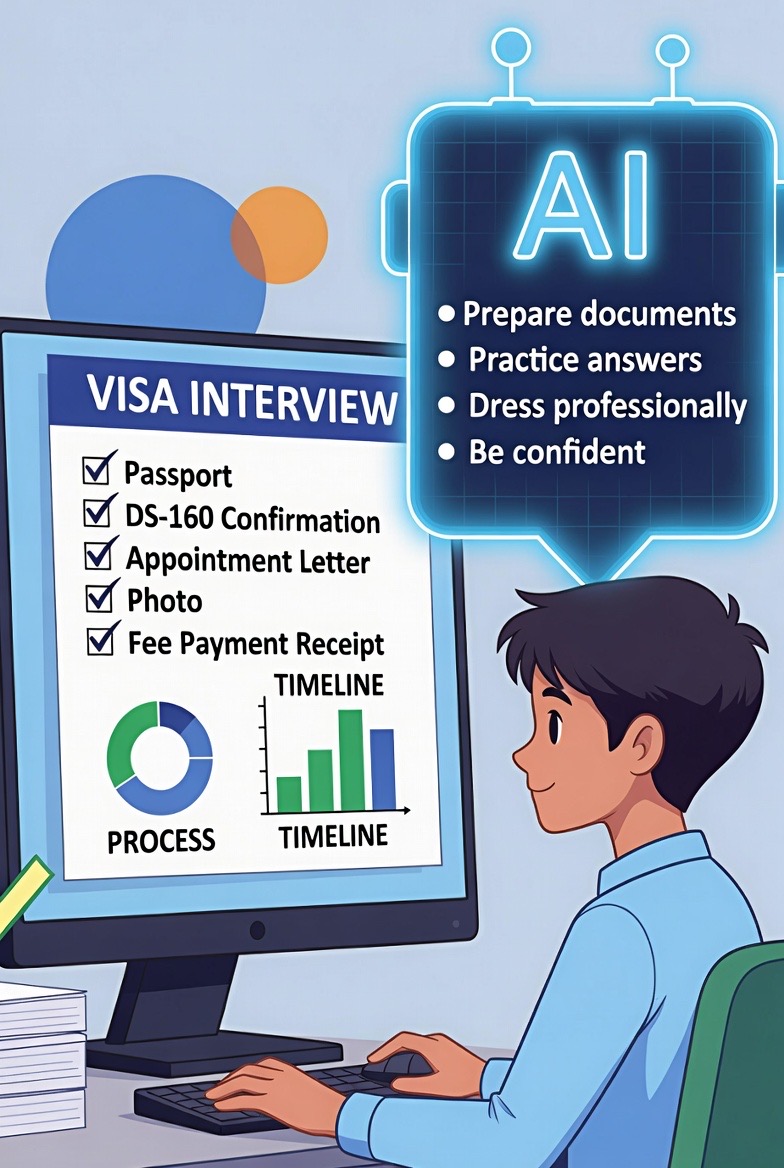 Prepare for success: Step-by-step visa application guide, realistic interview simulations, test practice & tips from experts. Ideal for F-1, student & tourist visas.